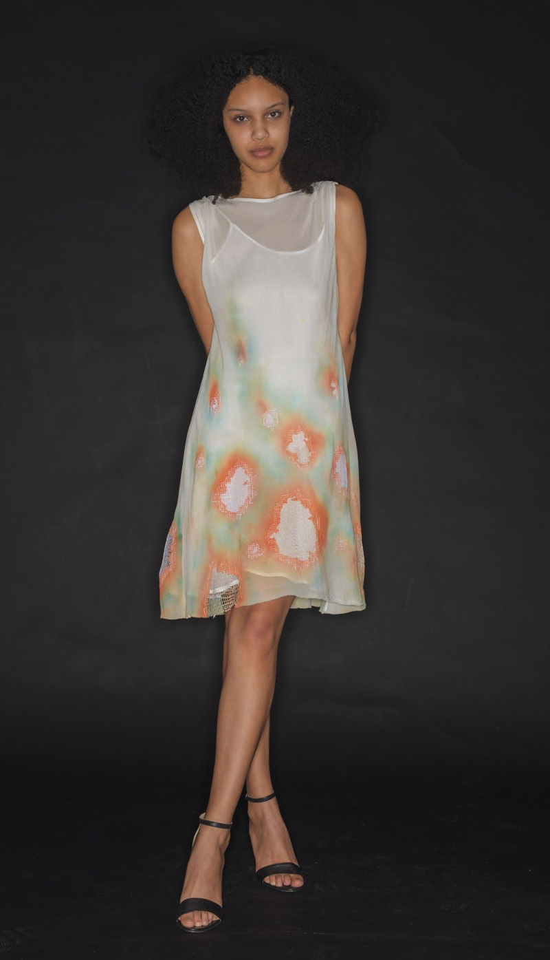 My project takes advantage of the draped movement afforded by bias-cut chiffon, layering a slip and an overlay to create an ethereal, cloudy look. This is contrasted by the vibrant orange-red color surrounding distressed holes in the chiffon, a nod to ozone degradation, which fades slowly into blue. The neckline of the slip and the overlay are curved in a similar manner, creating visual unity. Finally, the holes in the chiffon are repaired through visible mending using sewing thread in the same white as the base chiffon, representative of hopefulness in the face of destruction.