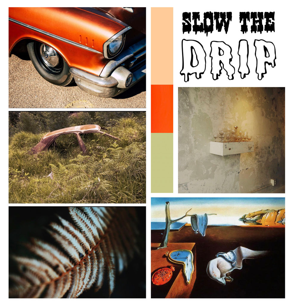 "Slow the Drip," an exercise in flat pattern construction for a button-up shirt and pants, was inspired by the processes of natural decay that occur in nature and in natural fibers. The earth-toned fabrics in combination with the organic line detail on both the pants and the shirt contribute to the motif of natural decay. The gradient colored beading in combination with the suspension of the tops and bottom portions by black strings mimics the appearance of a garment burned by fire. Both the pants and top have organic lines–the shirt along the placket and the pants on the edges–which unify the two pieces, and both the shirt and pants contain beading details.